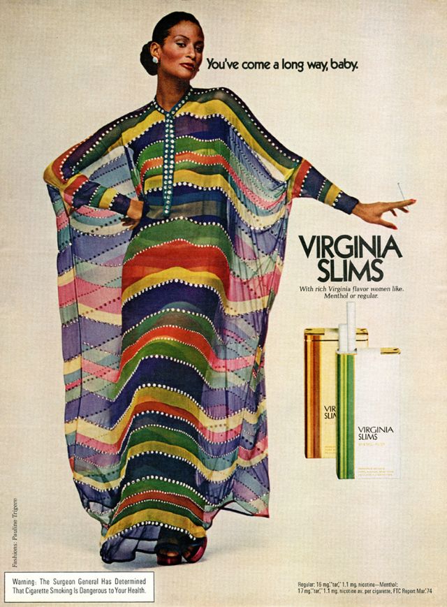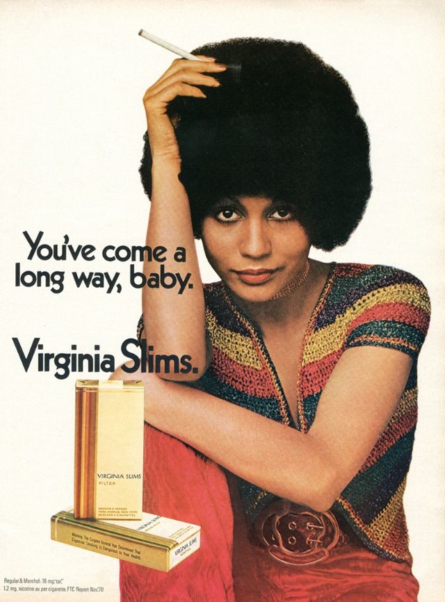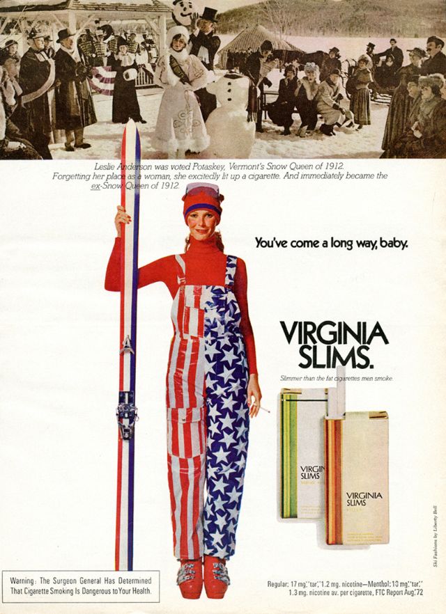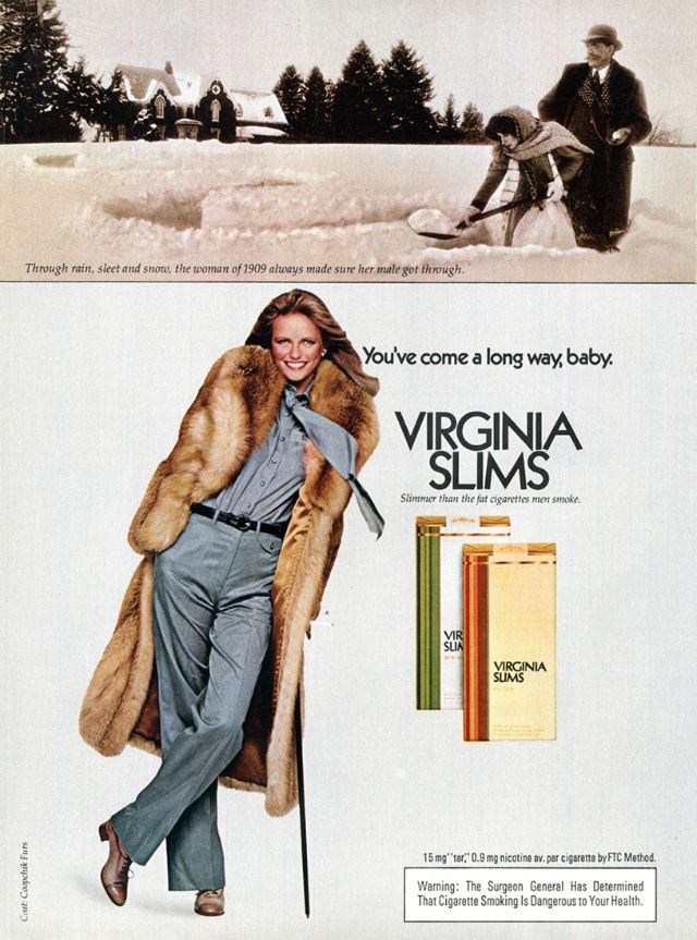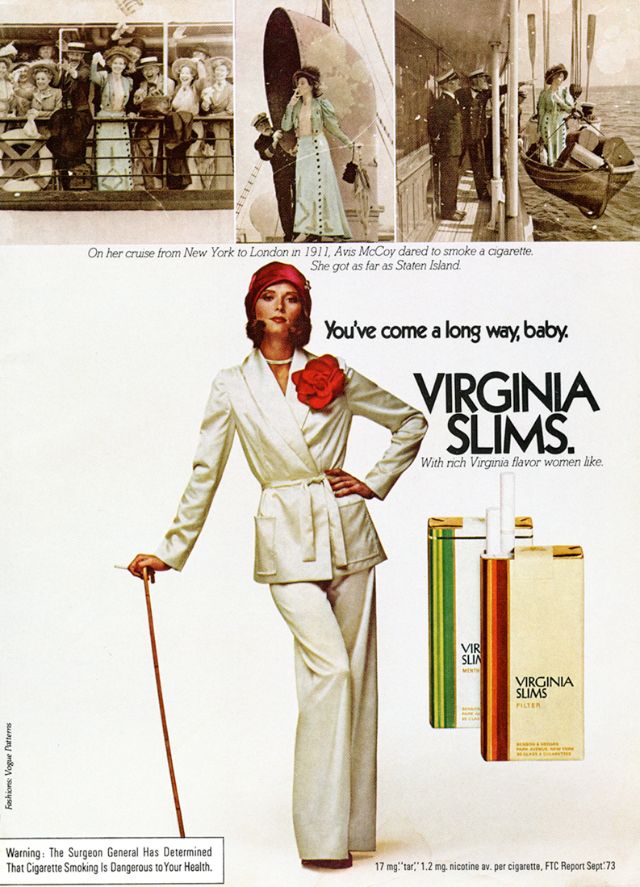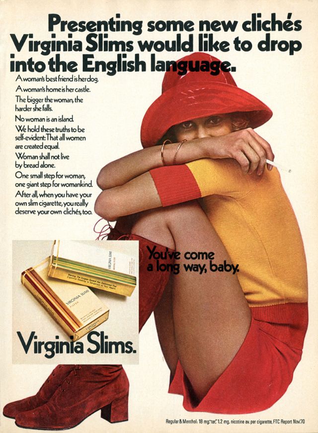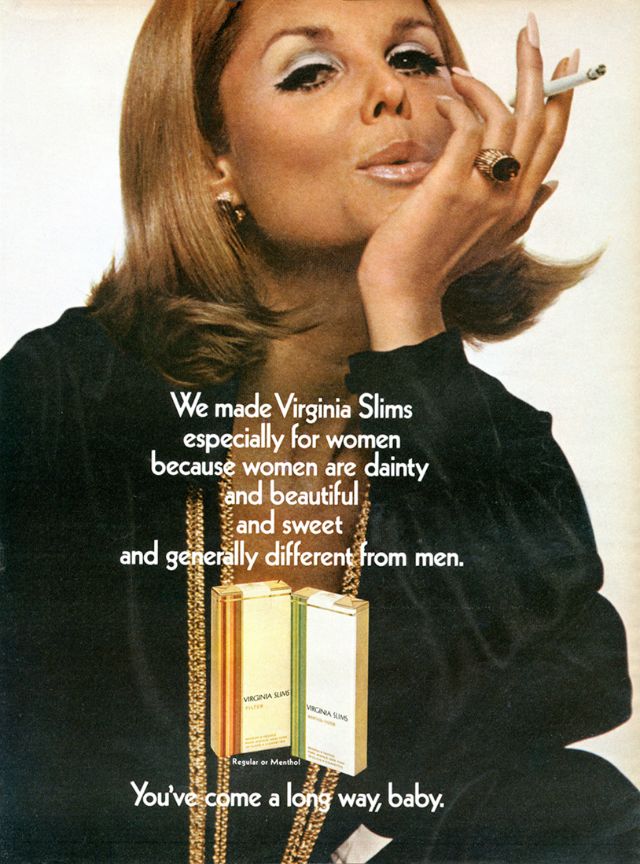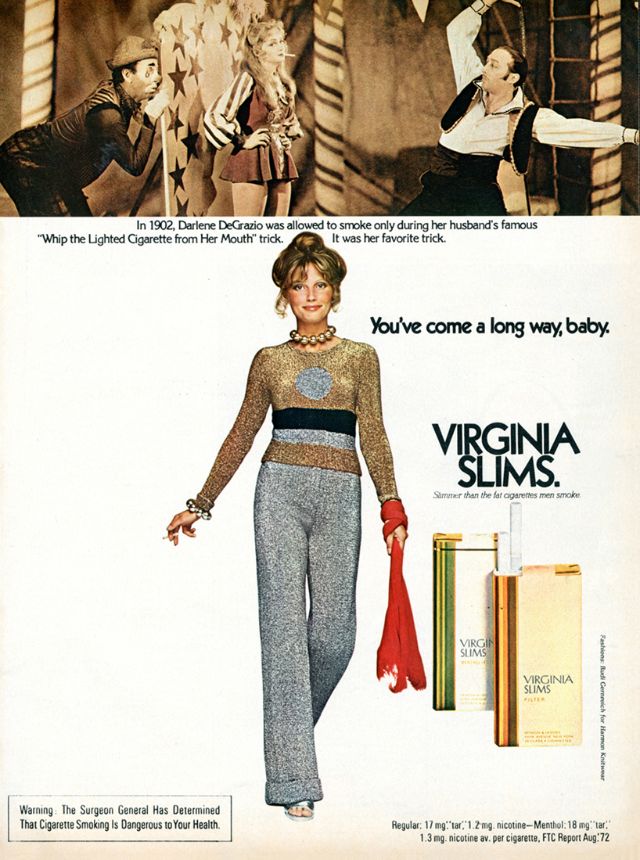 Как раз в то время, когда феминистское движение набирало силу и популярность, компания Phillip Morris объединилась со знаменитым агентством Leo Burnett Agency, чтобы извлечь выгоду из этой смены взглядов общественности. Рекламная кампания была посвящена новой марке ультра-тонких сигарет Virginia Slims. Она был специально и беззастенчиво нацелена на женщин, что само по себе было новым явлением. Каждая рекламная акция этой кампании ставила женщину в центр внимания, приравнивая курение Virginia Slims к независимости, стильности, уверенности и раскрепощенности. Сам лозунг прямо говорил о прогрессе, за который боролись женщины по всей Америке. Женщины действительно прошли долгий путь (игра слов, если фразу перевести дословно) с тех пор, как реклама впервые появилась на сцене. Лозунг " Ты преуспела,детка! " остаётся одним из самых удачных в истории рекламы.