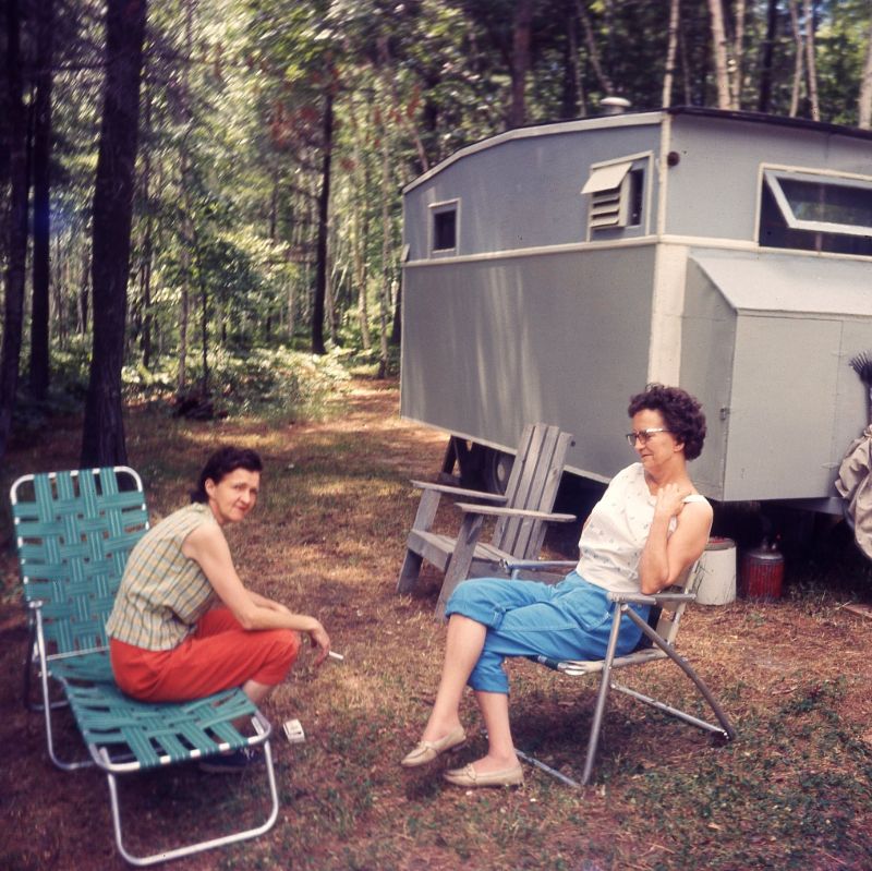 | Two ladies outside a camping trailer, circa 1964 |