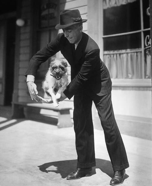| Gary Cooper, with his dog the breed is a Sealyham |